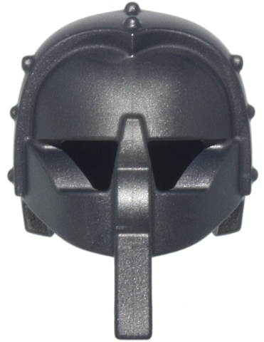 Unikatowy hełm minifigurki, znany jako “Helmet Castle / Fantasy with Rivets, Mask with Eye Holes and Long Nose Protection”. Wydany w 2024 roku, wykonany jest w kolorze ciemnoszarym perłowym (Pearl Dark Gray) i charakteryzuje się nitami oraz maską z otworami na oczy i długim noskiem chroniącym twarz.